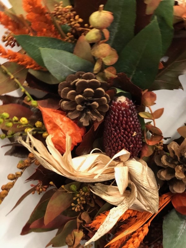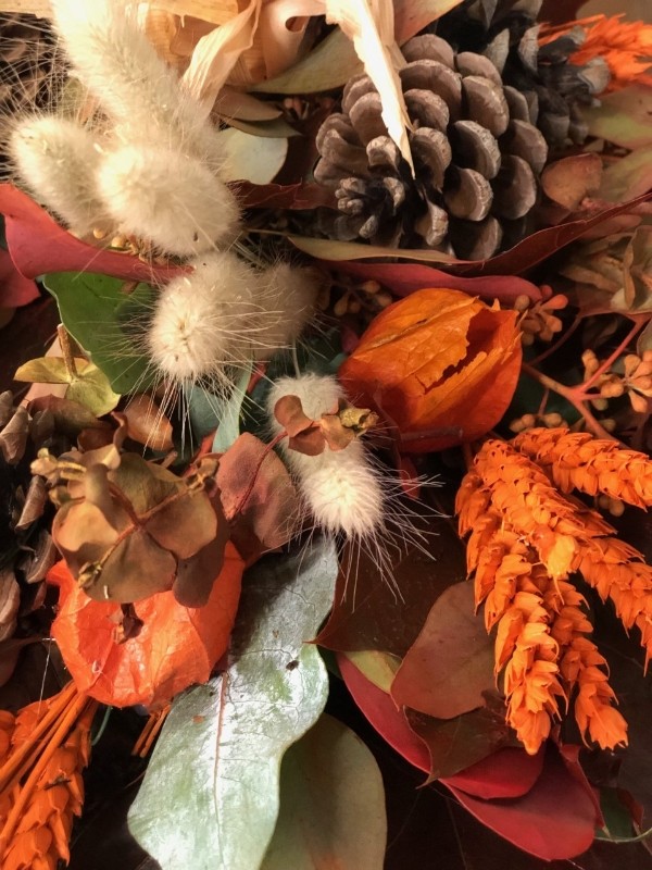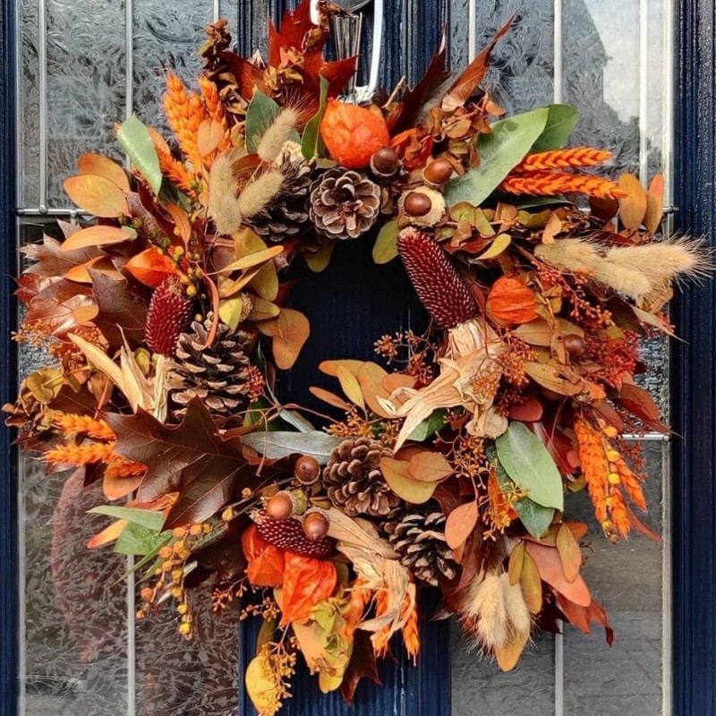 A beautiful fresh Autumn door wreath, a welcoming adornment for your front door, filled with rich, warm colours of the season, red, brown, orange.