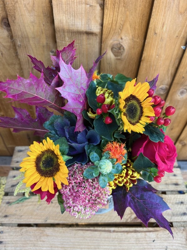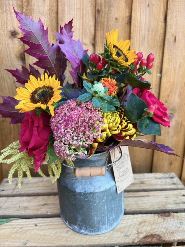 A petite vibrant selection of of fresh autumn seasonal flowers perfectly displayed in a mini metal keepsake milk churn.