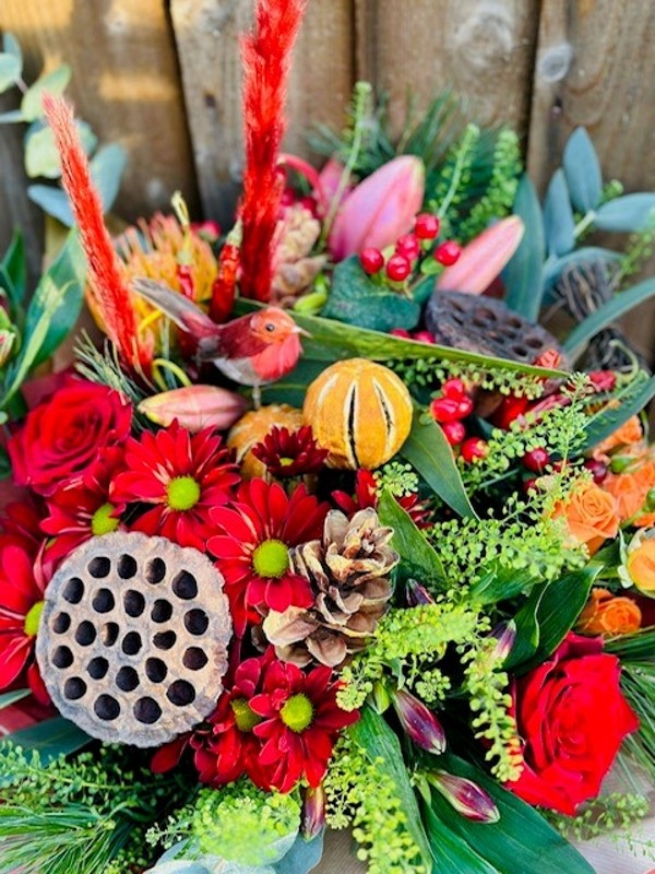 A fresh traditional bouquet filled with everything we love about Christmas, beautiful fresh flowers teamed with lush scented evergreen foliage, pine cones, berries and seeds, oranges and cinnamon, all traditional favourites.This design is in water, presented in a craft box finished with luxury ribbon.