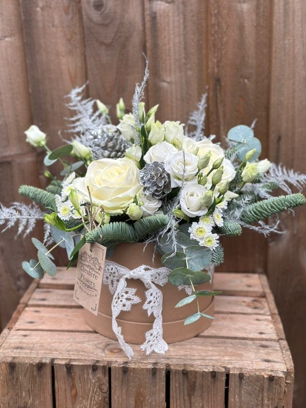 Our All that Glitters Hatbox is a contemporary, elegant design including beautiful white roses, teamed with other seasonal white flowers , evergreen foliage, eucalyptus with sparkling fern and pine cones, all presented in a keepsake craft hatbox finished with lace.