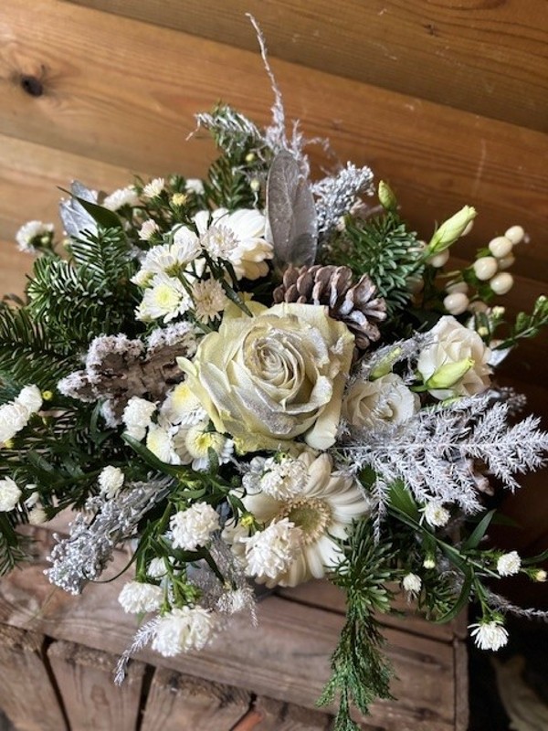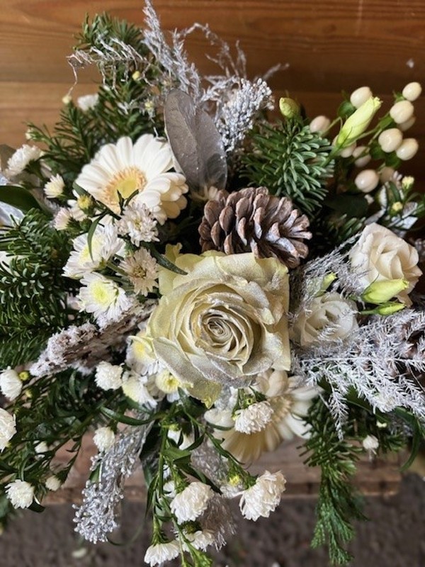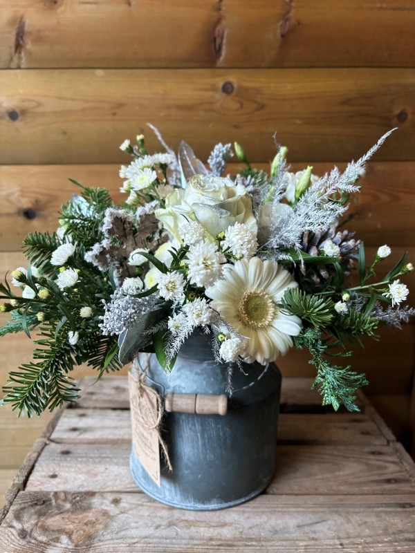 Our Winter Frost churn is a delightful petite arrangement of wintry white and frosty silver seasonal flowers and evergreen foliage, including a wooden frosted snowflake trinket, all beautifully presented in a small keepsake metal churn.
