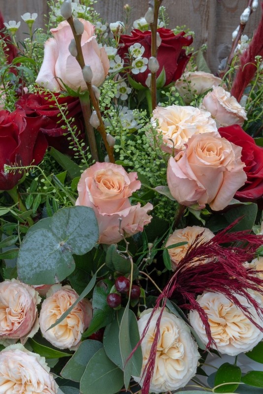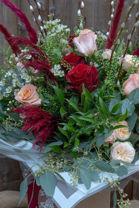 Sweet Kisses rose bouquet is a luxurious floral design that will certainly Wow your recipient, a beautiful hand tied arrangement of red and peach roses, spray roses teamed with scented pretty waxflower, eucalyptus as well as lots of lush textured foliage, pussy willow, with an added touch of trendy pampas grasses, all presented in a craft box finished with luxury lace makes this an impressive gift.