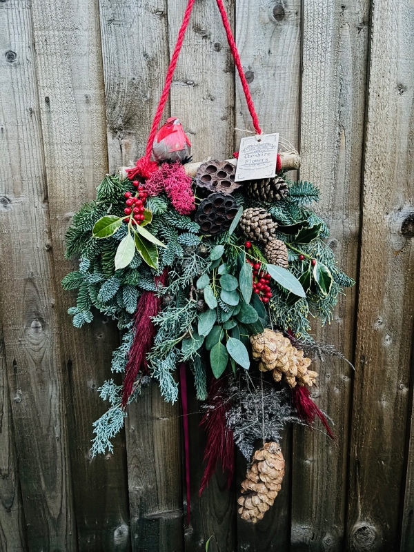 Adorn your home with a beautiful Swag design on a birch branch, elegantly draped with fresh evergreen foliage, adorned with colour-dipped ferns, natural cones, and festive Christmas accessories. It's a charming addition to your decor or a delightful alternative to a traditional door wreath.