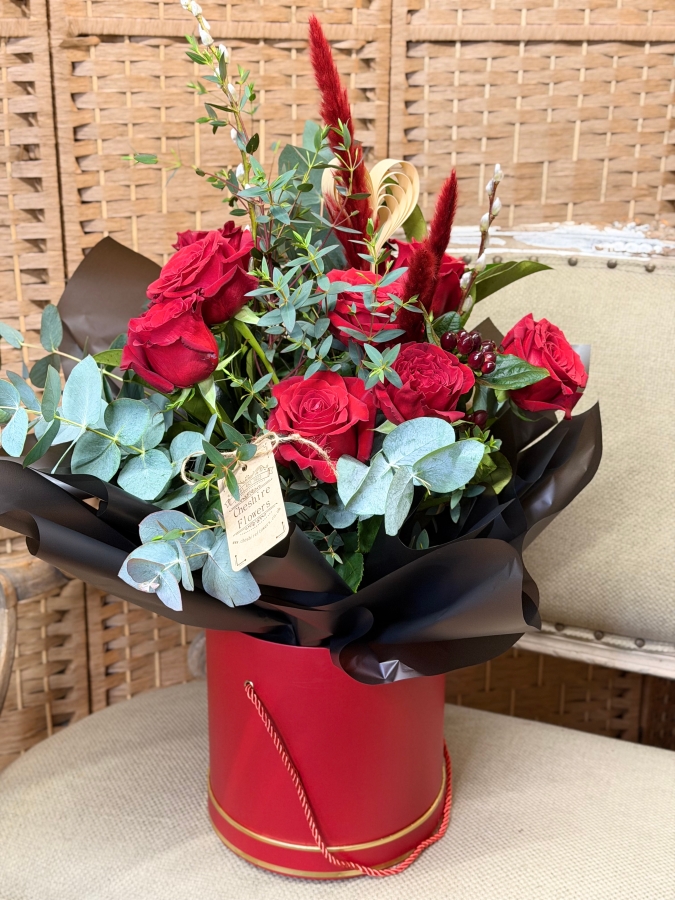 A luxury hand-tied red rose bouquet presented in a rich red tall keepsake hatbox. Designed with premium red roses, complementary foliage, seasonal berries, soft pampas grass, and finished with a romantic origami heart pick.